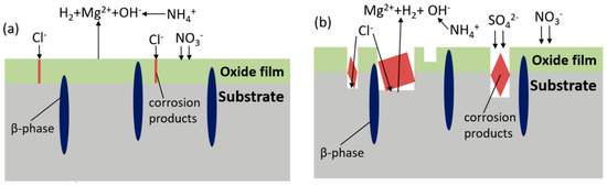 - Second stage (shown in Figure 16b). As the corrosion develops, the resistant β-Mg17Al12 dissolves, thus aluminum concentration elevates and the precipitation of MgAl2(SO4)4·22H2O is formed according to Reaction (2), resulting in a higher corrosion rate. Corrosion continues to develop in pits, where bare α-matrix is firstly to be corroded and is consumed up by OH−, then β-phase reacts with OH−, generating Mg2Al(OH)7 and AlOOH. Cracks generally appear on the coverage and film drops out, even in a severe process, Mg particle surrounded by completely corroded material falls into solution, resulting in bare Mg exposed to the solution. Meanwhile, and Cl− keep attacking to form deeper pits.