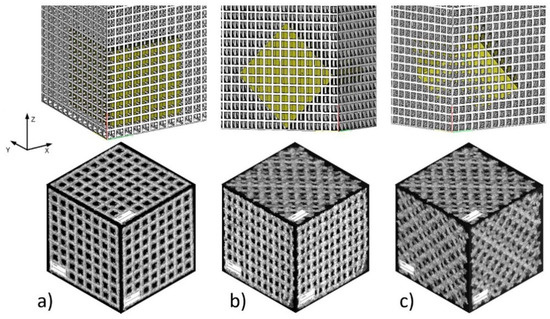 The use of such manufacturing process parameters ensures sufficient material melting and allows to achieve material density close to or equal to 100% [26]. Three variants of BFS specimens featuring diversified internal structures were manufactured (Figure 2). Several proposals were prepared of geometric strut structures that could serve as the scaffold for bone implants. The application of varying orientation of individual struts within the cubic sample aimed to determine the impact of the architecture of the BFS sample relative to the force direction with respect to mechanical properties.
