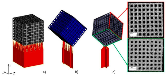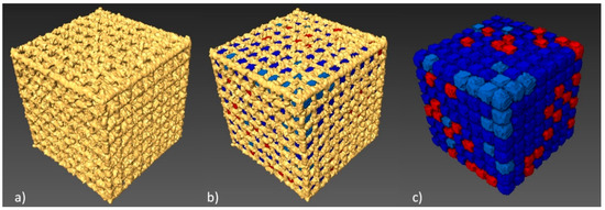 A computer-aided design (CAD) was created using the Magics software (15.0, Materialise HQ, Leuven, Belgium). A model of a porous unit cell built of struts was designed in the form of a cube (Figure 1a). Strut diameter was set at 150 µm, while the distance between strut axes was 600 µm [26]. The cubic model of the specimen used in the study was composed of 512 unit cells (8 in each direction) that formed a 4.95 × 4.95 × 4.95 mm cube (Figure 1b,c). The porosity of the designed structure was 85%. The designed geometry of BFS specimens is shown in Figure 1.