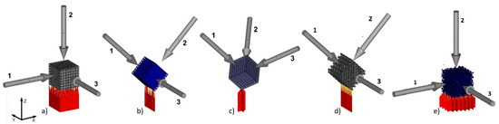 BFS models for analysis and manufactured sample orientation relative to the build platform and marked loading directions for individual samples: (a) A1, (b) A2, (c) A3, (d) type B, (e) type C.