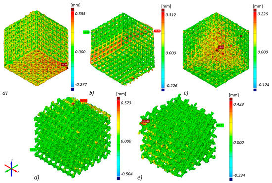 Thanks to technical computed tomography (CT) reconstruction, the internal geometry of the fabricated BFSs was evaluated. A-type samples were subjected to testing as they displayed the best mechanical performance and show geometry-dependent anisotropy of properties. During the first stage of the CT analysis, the geometry of the designed BFS structures was compared with the actual geometry of the fabricated structures. The actual models (reconstructed, STL format) were fitted to the nominal models (designed, CAD format) using the ‘best-fit’ method. The above enabled to determine the deviations between design geometry and models obtained on the basis of CT reconstruction for the manufactured elements in differing positions relative to the build platform (Figure 5).