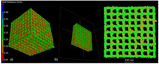 Technical computed tomography was used to record the external and internal geometry of the fabricated structures. The analysis was performed using Zeiss METROTOM 1500 CT system (Carl Zeiss GmbH, Oberkohen, Germany) to enable coordinate measurements of complex geometric structures. All CT measurements were performed at resolution of 21.3 µm. Based on CT reconstruction, an analysis of geometry deviations was performed using GOM Inspect V7.5 (GOM GmbH, Braunschweig, Germany), while wall thickness analysis of the struts was performed using VG Studio Max 2.0 (Volume Graphics, Heidelberg, Germany). Additionally, porosity analysis was performed with Avizo 8.0 (FEI, Hillsboro, OR, USA).