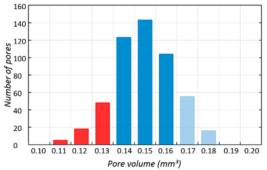 512 pores were registered; the smallest of which had a volume of 0.11 mm³, while for the largest—0.18 mm³—the nominal volume of a single pore was 0.2 mm³. Our analysis has shown that all identified pores had a smaller actual volume. However, it should be noted that no blocked pores were identified and, consequently it has been confirmed that all channels are fully unobstructed. Figure 8 shows a histogram of pore volume distribution.