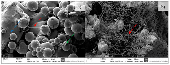 Osteoblasts after seven days of incubation on the tested implants. Samples not subjected (non-CP samples) (a) and subjected to chemical polishing (CP samples) (b). Blue arrow indicates BFS material; green arrow indicate adhered cells, while red ones extracellular matrix produced by osteoblasts, SEM.
