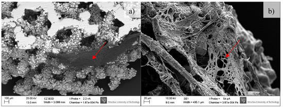 Osteoblasts after 14 days of incubation on tested implants. Samples non-subjected (non-CP samples) (a) and subjected to chemical polishing (CP samples) (b). Red arrows indicate increasing (please compare it to Figure 9) amount of extracellular matrix produced by osteoblasts, SEM.