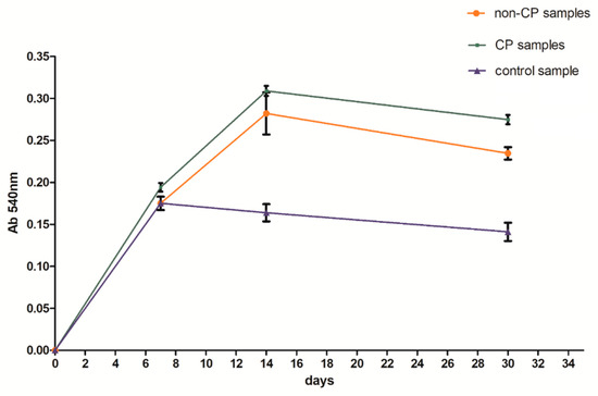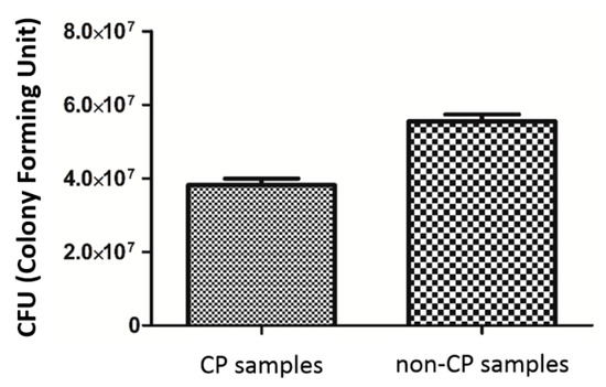 S. epidermidis biofilm formation on non-CP and CP samples.