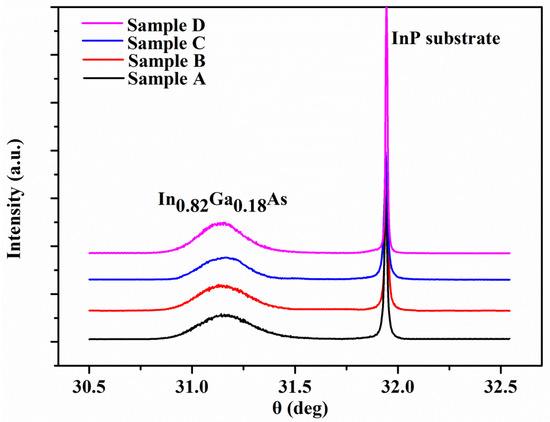 The double-crystal X-ray diffraction (DC-XRD) ω scans of In0.82Ga0.18As epitaxial layers grown on InP (100) substrates for sample A–D.
