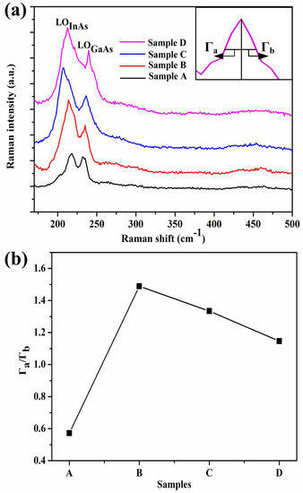 In addition to DC-XRD measurement, Raman scattering is an indirect way to characterize the crystalline quality of materials. Figure 4 shows the Raman spectra of In0.82Ga0.18As epitaxial layers for samples A–D. Two-mode Raman peaks are observed in each spectrum which correspond to longitudinal optical (LO) phonon modes of InAs and GaAs, respectively [30]. Because of the high content of indium composition, the peak corresponding to InAs-like LO is strong and sharp. In this experiment, the back scattering of (100) crystal orientation was adopted. According to the scattering selection rule of zinc-blend-type structure, there are only LO phonon mode peaks under the (100) backscattering in the In0.82Ga0.18As epitaxial layer. Furthermore, the asymmetry ratio (Γa/Γb) of Raman scattering spectra can be used to characterize the crystalline quality of samples [31]. The closer the asymmetric ratio is to 1, the higher the quality of the material. For In0.82Ga0.18As materials, the asymmetric ratios (Γa/Γb) of GaAs-like LO-phonon peaks are selected to characterize the crystalline quality of samples, which is displayed in the inset of Figure 4a. The calculated values of the asymmetric ratios of samples A–D are summarized in Figure 4b. It can be seen that the asymmetric ratios of samples A–D are not all 1, and the asymmetric ratio of the samples is closer to 1 increasingly from sample A to sample D, indicating that the crystalline quality for samples A–D becomes better and better. The results show that the crystalline quality of In0.82Ga0.18As epitaxial layers can be improved by the introduction of buffer layers with different structures, which is in accord with the DC-XRD measurements.