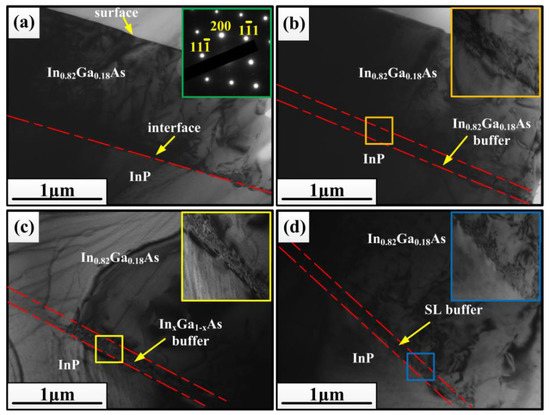 The transmission electron microscopy (TEM) images of In0.82Ga0.18As epitaxial layer grown on InP (100) substrates: (a) sample A without buffer layer; (b) sample B with In0.82Ga0.18As buffer layer; (c) sample C with graded InxGa1−xAs buffer layers; (d) sample D with In0.82Ga0.18As/In0.82Al0.18As superlattice (SL) buffer; the insets are the magnified images of three small frames in (b,c,d).