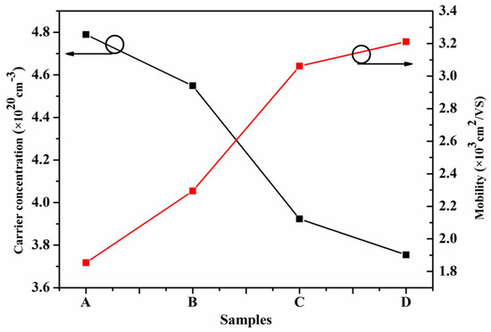 In addition, the quality of the In0.82Ga0.18As epitaxial layers is further characterized by Hall measurements with a magnetic field of 7000 G at 300 K. The results of Hall measurements are shown in Figure 6. In the epitaxial layers, defects such as dislocations can serve as scattering centers for carriers and thus limit the mobility. Therefore, the crystalline quality and electron property of the epitaxial layers can be illustrated by the Hall results. It is clearly shown in Figure 6 that the introduction of various buffer structures between epitaxial layers and InP substrates has a strong influence on the carrier concentration and Hall mobility of the In0.82Ga0.18As epitaxial layers. From sample A to sample D, the measured carrier concentration reduced and the measured mobility increased. Sample D with graded superlattice buffer layers has the lowest carrier concentration value (3.73 × 1020 cm−3) and the highest Hall mobility value (3.21 × 103 cm2/VS). Meanwhile, the calculated dislocation density in the In0.82Ga0.18As epitaxial layer of sample D is the least. Therefore, sample D has the best quality in epitaxial growth. Therefore, it can be concluded that the higher the mobility and the lower the carrier concentration of the material, the better the quality of the epitaxial layer.