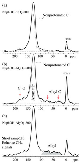 The 13C direct-polarization spectra of NaphOH-Al2O3-800 with a short recycle delay (1 s) are presented in Figure 3a,b, without and with probe-head background suppression, respectively. They show the broad signals of the sp3-hybridized carbon more prominently, and in particular, a peak near 32 ppm. In the corresponding spectrum after dipolar dephasing (Figure 3b, dashed line), the signals of a large fraction of these sp3-hybridized carbons are retained, indicating that they are not protonated. Moderate shift-anisotropy recoupling, which leaves the PDMS signal nearly unaffected, strongly dephases most other signals, including those of the sp3-hybridized carbons resonating between 10 and 70 ppm (Figure 3c); this is unusual, indicating the effect of paramagnetic shift anisotropy generated by unpaired electrons due to the dipolar coupling between the thermally averaged electron magnetic dipole moment and the nuclear spin [31,32,33,34,35,36]. Spinning sidebands and shift anisotropy dephasing due to paramagnetic shift anisotropy in detonation nanodiamond are documented in Figure S3.