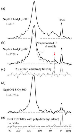 13C spectra of 2,3-naphthalenediol heat-treated at 800 °C after 1-s direct polarization (solid lines). (a) On Al2O3; (b) on Al2O3 with probe-head background suppression (b.s.); the spectrum after dipolar dephasing (dashed line) is also shown; the signal of sp3-hybridized carbon near 35 ppm is highlighted by a red arrow; (c) same as (b) after 4 × 31 μs shift-anisotropy recoupling. (d) On SiO2 with probe-head background suppression. (e) For reference, spectrum of neat TCP filler with PDMS after probe-head background suppression.