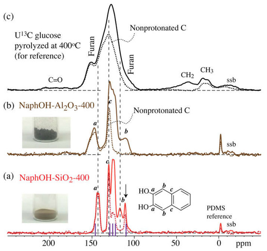MultiCP 13C NMR spectra (solid lines: full spectra; dashed lines: after dipolar dephasing) after heat treatment at 400 °C. (a,b): 2,3-naphthalenediol heat-treated on (a) SiO2 and (b) Al2O3. “ssb”: spinning sideband of the aromatic peak. The stick spectrum (purple vertical lines) in (a) marks the resonance positions of neat 2,3-naphthalenediol. (c) Bulk glucose char after 400 °C pyrolysis, for reference.