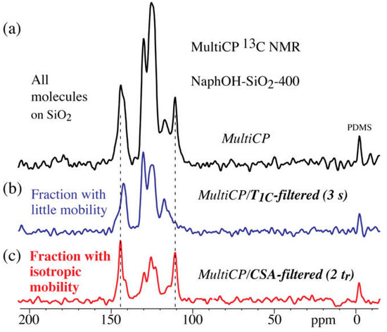 Notably, both 13C and 1H spectra (Figure 4a and Figure 5b) of NaphOH-SiO2-400 show additional sharp peaks. Their assignment was assisted by selective 13C NMR experiments such as 13C T1 and CSA filtering (Figure 6b,c, respectively). The spectrum after a 3-s 13C T1 filter selectively retains the broader signals of carbon segments with low mobility (specifically, with small spectral density of fluctuating magnetic fields at 2π 100 MHz). The sharp peaks that have been suppressed here are retained after CSA filtering, which removes signals of C=C carbons with little or no mobility [27]. The chemical shifts, slow chemical-shift anisotropy dephasing, narrow lines, and fast T1C relaxation indicate that the sharp signals from NaphOH-SiO2-400 are due to unreacted 2,3-naphthalenediol with fast, nearly isotropic mobility.