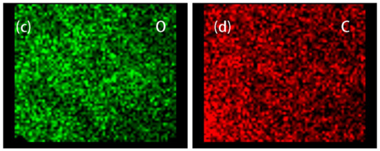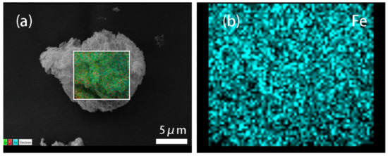 The morphology of the GF composite particle is shown in Figure 1a. As we can see, GF presents a near-spherical shape. Fe3O4 particles, as the core and most of the particle surface, are surrounded by graphene sheets. To further testify the structure of GF, the GF particle was analyzed by energy dispersive spectrometer. Figure 1b–d are the mapping images of iron, oxygen, and carbon elements, respectively. The above discussion indicates that Graphene and Fe3O4 particle was compounded when available.