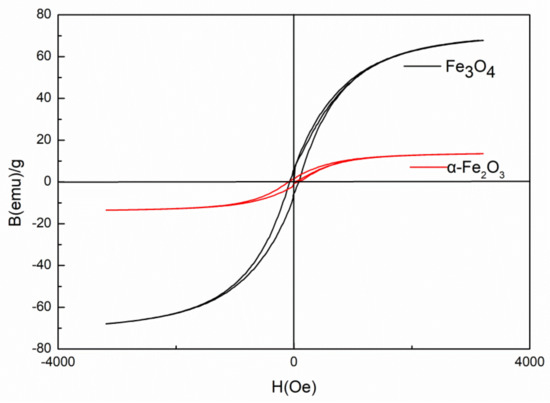 As reported in the literature, a high temperature is commonly used for demagnetization [21]. Demagnetization of Fe3O4 (α-Fe2O3) was obtained by heating Fe3O4 particles up to 500 °C (under air atmosphere) to improve the dispersion of Fe3O4 in the PBMA matrix. The magnetic properties of Fe3O4 and α-Fe2O3 were studied by a vibrating sample magnetometer at room temperature. As shown in Figure 2, Fe3O4 presents the highest magnetization and α-Fe2O3 shows the lowest magnetization after heating at 500 °C.