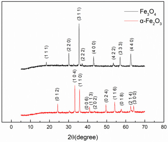XRD patterns of Fe3O4 and α-Fe2O3. Particles were indexed according to the standard of ICDS Cards, 74-0748 and 79-0007 for Fe3O4 and α-Fe2O3, respectively.