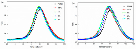 For α-Fe2O3, to improve the dispersion of Fe3O4 in the PBMA matrix in the present study, demagnetization of Fe3O4 (α-Fe2O3) was incorporated into the PBMA. The maximum tan δ of PBMA/α-Fe2O3 increased and the temperature range with tan δ > 0.3 became wider, as shown in Figure 5b and Table 3. The damping properties of the composites improved. Moreover, when the weight content of α-Fe2O3 was 1%, the tan δ reached 1.63, and the corresponding temperature range, with tan δ > 0.3, was about 103 °C. The results show the demagnetization of Fe3O4 (α-Fe2O3) could increase the internal friction due to homogeneous dispersion of α-Fe2O3 in the PBMA matrix (Figure 4e). Moreover, Tg of the α-Fe2O3 composites shifts to low temperature as seen from Figure 5b and it is more obvious to shift to low temperature comparing to Fe3O4 composites.
