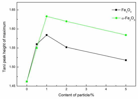 Curves of the variations of tan δ with the temperature of Fe3O4 and α-Fe2O3 composites are shown in Figure 5 and Figure 6, respectively. The loss tangent (tan δ) is commonly called damping and is the evaluation measure of energy dissipation. The values of the maximum heights versus the loads of particles are shown by Figure 6. As is seen, Fe3O4 and α-Fe2O3 show similar influences on the maximum heights of tan δ.