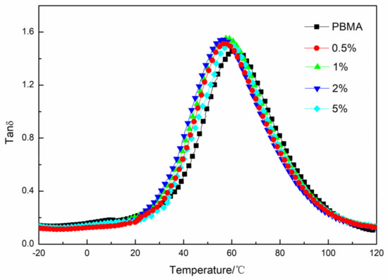 The glass transition temperature (Tg) of the composites, taken at the maximum value of the tan δ, is determined by the DMA [25,26]. As observed from Figure 5a, increasing the mass fraction of Fe3O4 shifted the curve peak to low temperatures, with the incorporation of 1% Fe3O4 into the PBMA matrix leading to the greatest decrease in Tg, referring to neat PBMA. This phenomenon can be interpreted as follows: With the inclusion of Fe3O4 into PBMA, the Fe3O4 particles interact with and shield carbanyl groups and, as a result, a lowered Tg was observed.