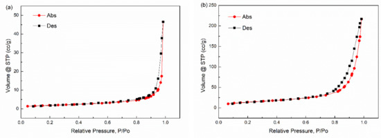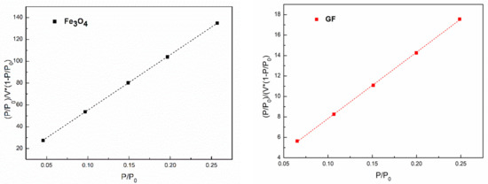 Thus, the vs. () should be linearity. The linear fitting was used and the results (BET spectra) are plotted in Figure 8. According to the slope and intercept of these fitting lines, we can obtain the value of Vm. In Figure 8, all dots can be linearly fitted in some degree (R2 > 0.9). The values of the surface areas measured by BET (SBET) are listed in Table 5. According to Table 5, the SBET of GF is larger than that of Fe3O4, which may be caused by graphene, which has a larger specific surface. Moreover, to better understand the surface distribution of the materials, the spectra of nitrogen absorption and desorption for BET is shown in Figure 9.