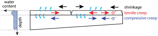 Measuring of drying shrinkage strains at early concrete ages is associated with additional difficulties, as hydration and drying occur simultaneously and may interact [59]. Moreover, eigenstresses due to nonuniform drying arise and may induce additional microcracks at the specimen surface. These microcracks may relax parts of the eigenstresses (tensile stresses in the near-surface area and compressive stresses in the core) and decrease the potential for drying shrinkage [26,38]. In the case of tensile loading, more microcracks may be created on the surface of the unsealed loaded specimen compared to the load-free specimen [26], especially at early concrete ages at loading, when tensile strength is low. With progressing time, crack lengths and crack widths increase and, hence, the kinetics of drying shrinkage may be accelerated [26]. The latter is supported by the findings in [68,69], according to which cracking accelerates moisture diffusion in concrete.