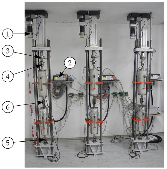 Experimental setup for determining tensile creep strains of sealed and unsealed specimens: ➀ linear actuator, ➁ digital controller, ➂ load cell, ➃ and ➄ spherical calottes, and ➅ two-sided spherical calotte.