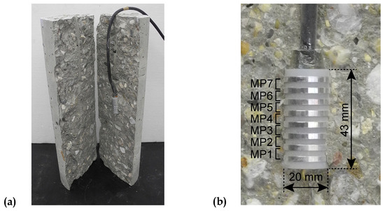 At the center of each cylindrical specimen (Figure 4a), the evolution of the mass water content was determined by means of a multi-ring-sensor (MRS), which was developed at the Institute for Building Materials Research of the RWTH Aachen University (ibac) [56,57,58]. The sensor used in this study consists of 8 stainless steel rings, separated by insulating polymer rings. Its dimensions are similar to the maximum grain size of mm. The electrolytic resistance is determined between each pair of adjoining stainless steel rings by impedance measurements [57]. The 7 measuring points (MP) are shown in Figure 4b. The respective mass water contents were determined by means of a calibration curve for hardened concrete. The latter characterizes the relationship between electrolytic resistance and mass water content of the respective concrete. It is determined by measuring the 2-electrode resistances on small specimens [58], when moisture equilibrium at a given relative humidity is reached. Hence, for young concrete the values of the mass water content can be compared only qualitatively. The measuring accuracy of the MRS is about 0.3% of water content [45].