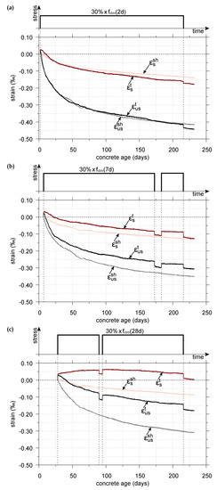 Figure 5 depicts the measured evolution of the total strain and , determined on sealed and unsealed specimens, respectively, loaded at the concrete ages of = 2, 7, and 28 days to 30% of the respective average uniaxial tensile strength at the concrete age at loading (schematically shown at the top of each figure), and the measured evolution of the respective autogenous shrinkage strain and combined autogenous and drying shrinkage strain . The results of the shrinkage tests for both sealed and drying conditions have been recently published in [45] and are provided again in Figure 5 for completeness.