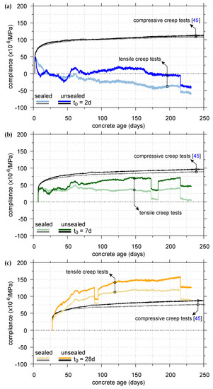 The scatter of the compliance functions for creep in tension, depicted in Figure 6, is the consequence of calculating the differences and from very small measured strains of about the same magnitude. Despite those problems, the following trends can be observed: The evolution of the compliance of the sealed and unsealed specimens loaded in tension depends on the concrete age at loading and the test conditions. For example, the compliance of the sealed specimen, loaded at the age of two days, starts to decrease continuously about three days after loading, while the one of the unsealed specimen decreases quite sharply about 30 h after loading, and remains almost constant from the age of seven days until unloading at the age of 216 days with values close to zero. The compliance of the sealed specimen, loaded in tension at the age of seven days, remains almost constant until unloading, whereas the respective compliance of the unsealed specimen initially evolves quite similar to the one of the sealed specimen. However, at the age of about 50 days, the compliance of the unsealed specimen starts to increase slightly. The compliance of the sealed and unsealed specimens, loaded at the age of 28 days, is continuously increasing until unloading. Hence, for sealed and unsealed specimens loaded at the age of 28 days, the compliance increases due to an increase of the tensile creep strain. The latter is in line with the usual definition of the creep strain as the time-dependent increase of strain under sustained constant load [7]. On the contrary, for specimens loaded at the ages of seven days and two days, the compliance remains almost constant or even decreases, which is physically unreasonable. However, a review of the relevant literature shows that similar results were reported by researchers for basic tensile creep [13,15,16,17,26,27,64,65] and for drying tensile creep [66,67]. Several authors [16,17,26,27,64,65] concluded that negative or vanishing tensile creep strains are the consequence of the incorrect assumption of the additive decomposition of creep and shrinkage strain, i.e., the actual shrinkage strain of a loaded specimen is different from that of the load-free companion specimen. Hence, subtracting the autogenous shrinkage strain from the total strain of a sealed loaded specimen or the combined autogenous and drying shrinkage strain from the total strain of an unsealed specimen will not reflect the load-induced strain, as explained in [17].