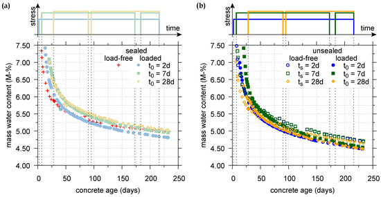 Evolution of the mass water content (a) for the sealed load-free specimen and sealed specimens, loaded in tension at = 2, 7, and 28 days; and (b) for unsealed load-free specimens and unsealed specimens, loaded in tension at = 2, 7, and 28 days, exposed to drying at the respective concrete ages or , respectively.