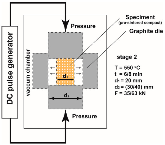 The final stage was the powder consolidation, which ran directly in the SPS device (HP D 10, FCT Systeme GmbH, Rauenstein, Germany), realizing a different strain. The process conditions are presented in Table 2. The first option included a classic, one-step process of SPS consolidation in a graphite matrix with a diameter of 20 mm, temperature T = 550 °C, and pressure of 50 MPa. This process was previously optimized to obtain material of the highest density.
