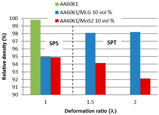 As a result of running a number of optimization processes for SPS sinters in the case of pure aluminum and the addition of a small amount of layered crystals up to 2 vol %, a high density exceeding 99% is achieved [4]. The proportion of additives exceeding 5% by volume is associated with the presence of a certain amount of pores at the interface and between the additive particles. Then the density of the composite drastically decreases. In the case analyzed, for the 10 vol % process, optimization allowed the achievement of a relative density near 95%. Density measurements for material subjected to SPT processes indicate an improvement for MLG composites up to 98.1%. However, the increase in the deformation ratio has little effect on further improvement of the density (98.2%).