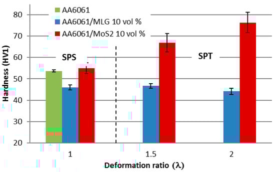 For the SPS process, the addition of 10 vol % of MLG flakes slightly reduces the hardness from 54 HV1 for the aluminum alloy sinter to 46 HV1 for the composite. The use of the SPT process with a low deformation ratio (λ = 1.5) has very little effect on hardness and leads to its increase to about 47 HV1. Increasing the deformation ratio slightly reduces the hardness to the level of 44.5 HV1. Composites with the addition of MoS2 flakes behave differently, and when using the SPT process there is an especially strong increase in the hardness of the composite. For the highest deformation ratio, the average hardness reaches 76.4 HV1. In this case there is a large standard deviation, which suggests a dispersion of the test value from the average. The examined hardness increase does not correlate with the density changes and can only be explained by microstructure analysis, which will be shown later in the article. The changes in the hardness of the tested composites are shown in Figure 6.
