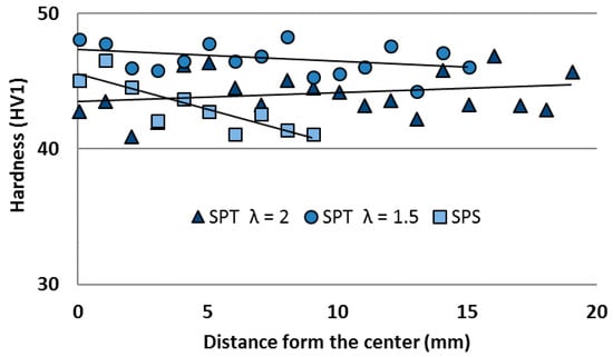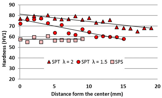 Because in practice such processes guarantee the inhomogeneity of stresses and strains [30] in the volume of the material being processed, one can expect far-reaching structure heterogeneities. Therefore, hardness tests were carried out on a cross-section parallel to the direction of the force acting during the sintering process. The hardness was tested from the central area to the edge of the sample on the long axis of this cross-section.