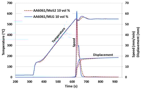 The charts below (Figure 9 and Figure 10) show a comparison of the second stage of the SPT process for the processing rate λ = 2. In both cases, the same volume of material was used and the process was carried out with the same parameters (force and heating speed). Time differences resulting from the unequal start of the heating process after filling the chamber with protective gas were eliminated in the diagrams. Figure 9 presents a comparison of three measured values: Temperature, speed of punch, and displacement of punch for composites with various types of reinforcement (continuous and dashed curve). Due to the size of the samples (a small volume of material) differences in the curves are almost imperceptible, but enlarging the area to reflect the displacement (Figure 10) indicates that the composite with MLG is easier to deform and the punch is moved at a higher speed than the composite with MoS2. Similar relationships were observed for the process with λ = 1.5 and their analysis suggests that the effect is proportional to the deformation ratio.