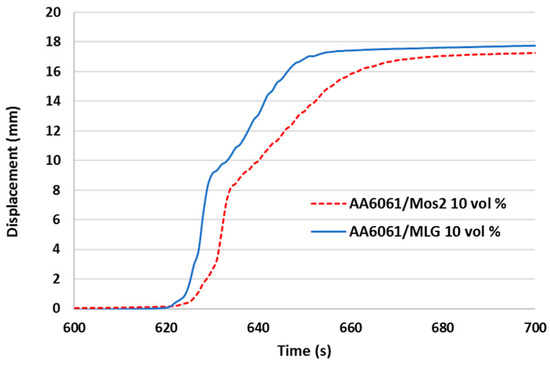Displacement of punch for AA6061/MLG 10 vol % (blue solid line) and AA6061/MoS2 10 vol % (red dotted line) during the SPT (λ = 1.5) process.