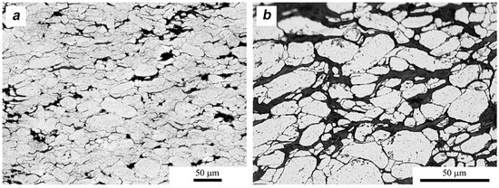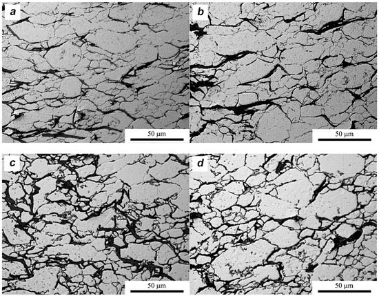 A slightly different situation is observed for composites with molybdenum disulfide (Figure 16). The deformation of the pre-sintered material causes movement in the MoS2 flakes relative to each other and the aluminum powder particles, but this movement is not directed. Because the flakes are not oriented in the structure, as in the case of MLG, and form an almost homogeneous barrier around Al particles, their displacement is statistically random. This entails a higher probability of rotation of the aluminum powder particles and leads to the homogenization of large areas containing the agglomerated MoS2 flakes visible in Figure 13a. The thickness of the MoS2 agglomerates observed at the grain boundary increases slightly and the boundary formed by them becomes more irregular. This is due to the fact that the platelets moving irregularly generate additional porosity, as detailed in Figure 17. The microstructure confirms the results of the density measurements presented earlier.