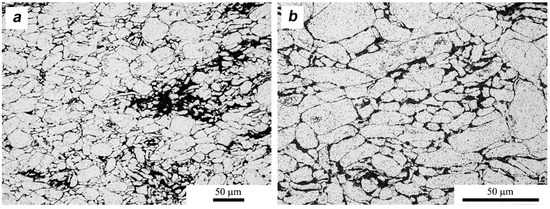 Microstructure of AA6061/MoS2 10 vol % SPT samples’ center areas (BSE SEM images): (a) λ = 1.5; (b) λ = 2.