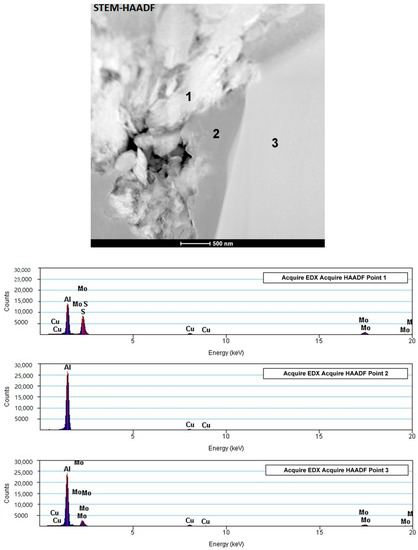 By analyzing the rich MoS2 area (Figure 19b) in the composites after the SPT process, we can see a significant fragmentation of platelets and the presence of small Al12Mo precipitates in the vicinity of the aluminum grains. The fragmentation of MoS2 is one of the factors influencing the possibility of chemical reaction with aluminum. The second factor is certainly the time of the process sustained for highly deformed composites. The longer processing time allows the diffusion necessary to create a new phase. Taking into account the influence of current pulses and pressure, temperature may rise locally and reach the melting point, which will further affect the observed phenomenon. Consideration of the presence of a new phase will certainly affect the results of relative density, but the estimated calculations indicate changes of no more than 1%.