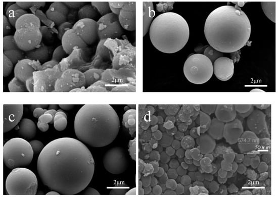 Compared with other structures, the microspheres have been widely concerned for its unique morphology []. Moreover, the pH value and solvent dosage have a great influence on the morphology of products synthesized by the hydrothermal method. In order to investigate the effect of the pH value on the morphology of TiO2 microspheres, TiO2 with different morphologies were prepared by changing the amounts of HCl in the reaction solution. The SEM images of the obtained products were shown in Figure 1. From Figure 1a, it can be clearly seen that the size of the as-obtained TiO2 microspheres are uniform and the microspheres are aggregated without the addition of HCl in the reaction solution. With increasing the amount of HCl to 0.03 mL and 0.43 mL, the microspheres with smooth surface can be obtained, and the sizes of microspheres are increased (Figure 1b,c). When 1.5 mL of HCl was added in the reaction solution, small-sized TiO2 spheres with an average diameter of approximately 500 nm were obtained, as demonstrated in Figure 1d. Based on the above results, it indicates that the amount of HCl added in the reaction solution can be used to control the morphologies and sizes of the products. With increasing HCl dosage, the hydrolysis rate of TBOT was inhibited, so the synthesized samples have good dispersibility. However, when HCl dosage in the reaction solution is too high, the growth of crystal grains will be hindered, resulting in the agglomeration of particles and reduction of size.