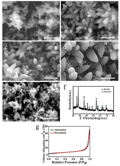Figure 3e is FESEM image of TiO2 flower clusters assembled with nanorods calcined at 400 °C. From this figure, it can be observed that the heat treatment didn’t destroy the morphology of the samples. The typical XRD pattern of the as-synthesized samples is illustrated in Figure 3f. The diffraction peaks are basically indexed to rutile TiO2 (JCPDS21-1276) []. Furthermore, the additional peaks appear at 25.4°, 38°, 48°, and 62.8°, which can be indexed to anatase TiO2 (JCPDS21-1272). The results of XRD indicate that TiO2 flower clusters assembled with nanorods were mixed crystal of rutile and anatase. From the analysis of BET surface areas of the samples, the N2 adsorption-desorption isotherm is shown in Figure 3g. The estimated BET surface area of the samples is 20.1 m2/g. The larger surface area and special morphology of flower-like structure together should contribute to the improved photocatalytic activity.