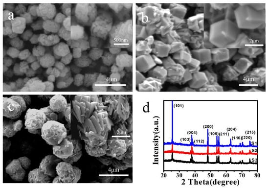 The porosity and structural properties on the surface of the samples have a certain influence on its photocatalytic performance. Hence, in order to systematically study the relationship between morphology, structure, and photocatalytic performance of TiO2, the hydrothermal synthesis of hexahedral and nanosheet structures with different morphologies were also carried out. SEM images and XRD patterns of the samples are shown in Figure 4. S1 was hydrothermally synthesized by using silica spheres as template, which showed hexahedral structures with an average size of about 500 nm. The surface was very rough and presented numerous striped porous structures (Figure 4a). Its formation mechanism can be interpreted as follows: during the hydrothermal reaction process, the hydrolysis of TiF4 was carried out. The generated TiO2 nanoparticles were deposited randomly on the surface of the SiO2 templates. After the templates were etched by sodium hydroxide aqueous solution, the porous structures as demonstrated in Figure 4a were formed. S2 was hexahedral structures with a side length of about 2 µm, which was prepared without the addition of SiO2 templates (Figure 4b). Compared with S1 (Figure 4a), microstructures with relatively smoother surfaces were obtained. Figure 4c presents the low- and high-magnification SEM images of the as-prepared S3. From this figure, it can be clearly observed that TiO2 microspheres were composed of a number of self-assembled crystal nanosheets with a thickness of approximately 100 nm. Compared with the preparation condition of S2, the new crystal began to nucleate and grow on the nanosheets due to the increased concentration of TiF4. As the hydrothermal reaction proceeded, more nanosheets were produced, and finally, the self-assembled TiO2 microspheres with nanosheets were obtained. Figure 4d shows the XRD patterns of S1, S2, and S3. Obviously, there were similar diffraction patterns and sharp diffraction peaks. The diffraction peaks were highly consistent with that of anatase TiO2 (JCPDS21-1272).