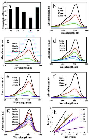 (a) The concentration decreases of Rhodamine B (RhB) aqueous solution in dark for 1 h before illumination; UV−vis spectra of (b) Ns; (c) S1; (d) Ms; (e) S3; (f) S2; (g) P25; and (h) kinetics of RhB degradation over samples.