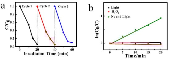 The catalytic longevity of the catalysts was also studied, and the results are shown in Figure 6a. After three cycles of degradation of Rhodamine B solution, the degradation rate of Ns is still very high. It thus demonstrates that the obtained catalysts possess excellent catalytic longevity. In order to investigate the influence of light and H2O2 on the degradation performance of the catalysts, a series of controlled catalytic experiments were performed. As shown in Figure 6b, it can be seen that no degradation of Rhodamine B can be observed under the condition that only light or H2O2 was applied during the photocatalytic process. When light and Ns was simultaneously applied, the degradation of Rhodamine B took place. The degradation rate is lower than that of the solution containing Ns and H2O2 (Figure 5h). From the above experimental results, it can be concluded that synergistic effects of Ns, light and H2O2 contributed to the enhanced degradation efficiency.