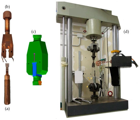 Experiments were performed with the specific test rig depicted in Figure 1. A uniaxial testing machine provided the axial force to simulate the centrifugal load on the blade. The dummy blade specimen is shown in Figure 1a. All specimens were made of intermetallic alloy Ti-48Al-2Cr-2Nb, manufactured through EBM. These dummies were specifically manufacture for this experiment with the same process that will be used for the real blade. It can be reasonably assumed that the microstructure of the dummy and real blade was the same. Also, the attachment dimensions in the dummy are the same as the real blades. The blade root was manufactured in the form of dovetail. Regarding wear mitigation, a Ni 22Fe 16Cr 1.5Si Sulzer Metco® coating with a thickness of 200 μm was applied by air plasma spray on the contact surfaces of dummy blades. To diminish the friction coefficient the coated surfaces was painted using a Surf-Kote® LOB-1800-G with a thickness 12–25 μm. The average roughness of the contact surfaces, measured after deposition, was Ra = 7 μm. The airfoil of the real blade was replaced by a M20 thread needed to assemble the dummy blade into the test rig.