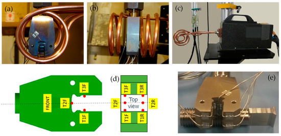 Heating coil setup front view (a) and side view (b); induction head with coil (c); sketch of thermocouple placement (d,e).