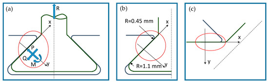 Beforehand, the state of stress in the contact region of the attachment, Figure 3, was studied with the analytical model of a flat punch with rounded edges. The two states of stress are equivalent if a proper equivalent radius is chosen and the stress distribution is symmetrical. The general dovetail geometry reported in Figure 3a shows a reference system (x, y) located at the center of the contact area. Forces P and Q are the normal and tangential forces applied at the contact area center. M is the moment due to non-symmetrical pressure distribution. The dovetail geometry can be reduced to the geometry of Figure 3c, in which the minimum equivalent radius is used. Figure 4 shows details of the contact geometry of the punch. Due to symmetrical stress distribution, the moment M is null.