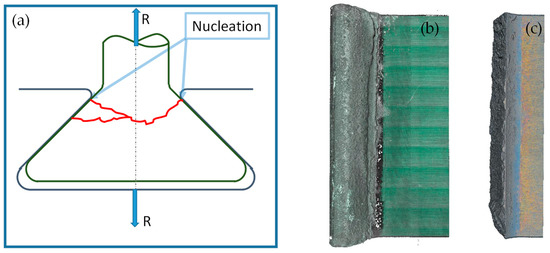 The results of the low-cycle fatigue experiment are reported in Table 1. In this type of application, 30,000 cycles is the expected life, thus experiment number 3 was stopped before failure (runout). Figure 6a shows a typical nucleation and propagation fracture. Figure 6b,c shows the optical topography of a specimen before and after the fretting fatigue test. It can be see that failure occurs on the blade close to the external end of the disk slot.