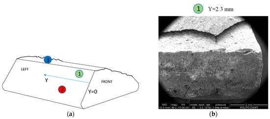 Scanning electron microscope (SEM) micrographs of test # 2, Y indicate the distance from the front surface: (a) position of SEM micrographs; (b,c) contact left surface; (d) fracture surface.